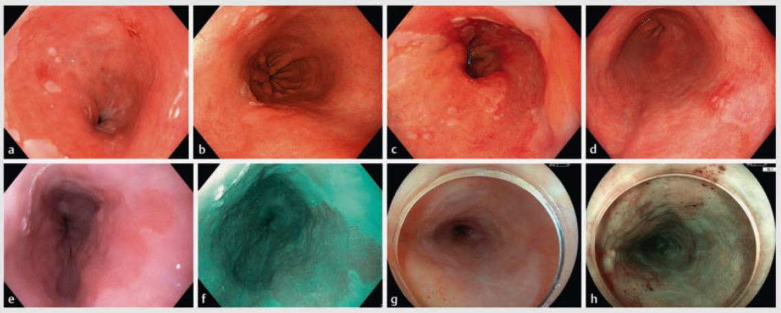 Fig. 1 Examples of subtle early esophageal neoplasia that can be easily missed if not recognized to be malignant or premalignant. a Early cancer in Barrett’s esophagus, Paris type 0-IIb (flat type), at the 1 o’clock position. b Early cancer in Barrett’s esophagus, Paris type 0-IIa-IIb (slightly elevated and flat), from5 to 7 o’clock. c Early cancer in Barrett’s esophagus, Paris type 0-IIa (slightly elevated), from 2 to 5 o’clock. d Early cancer in Barrett’s esophagus, Paris type 0-IIb-IIc (flat and slightly depressed), from 3 to 4 o’clock. e High grade dysplasia of the squamous epithelium, recognized as a darker red area in white-light endoscopy, Paris type 0-IIb (flat) from 1 to 6 o’clock; and f corresponding image with narrow-band imaging (NBI) showing a brownish discoloration from 2 to 7 o’clock. g Squamous cell cancer, Paris type 0-IIb (flat type) extending from6 to 1 o’clock, seen as slightly more reddish area with white-light endoscopy, and h corresponding image with blue-light imaging (BLI).