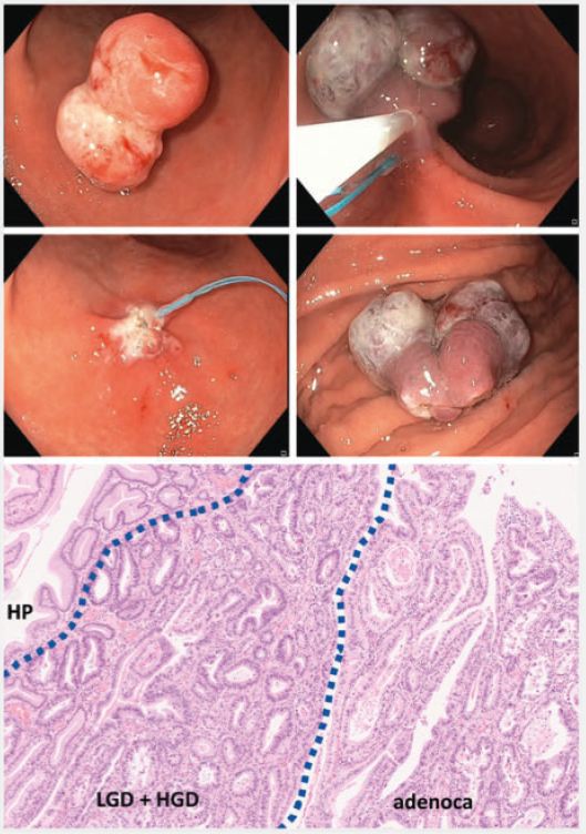 Fig. 3 Polyp removal and histopathology of a pedunculated large gastric hyperplastic polyp with neoplasia. a A large pedunculated hyperplastic polyp in the distal part of the gastric body. b After securing the base of the polyp stalk with an endoloop, the polyp was resected with an electrocautery snare placed over the endoloop. c The post-resection site. The base of the stalk remained secure with the endoloop. d En bloc resection of the polyp. e Histopathology of the removed polyp showed gradual transition from nondysplastic hyperplastic polyp, through low and high grade dysplasia, into adenocarcinoma (hematoxylin and eosin staining). HP, hyperplastic polyp; LGD, low grade dysplasia; HGD, high grade dysplasia.