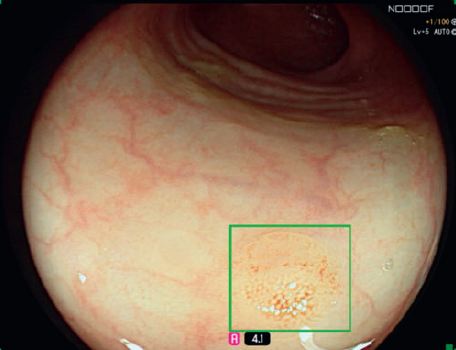 Fig. 1 Artificial intelligence (AI) system user interface. A single letter represents the histology prediction (A for adenoma and N for non-adenoma), and a numerical value represents the estimated size in mm. For all polyps where the novel AI sizing tool estimates a size of 10mm or larger, the output is displayed as ≥10mm.
